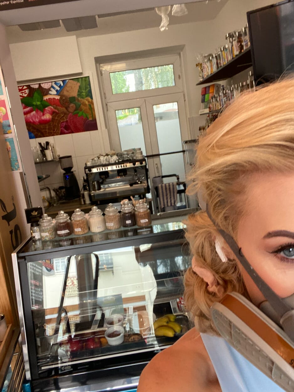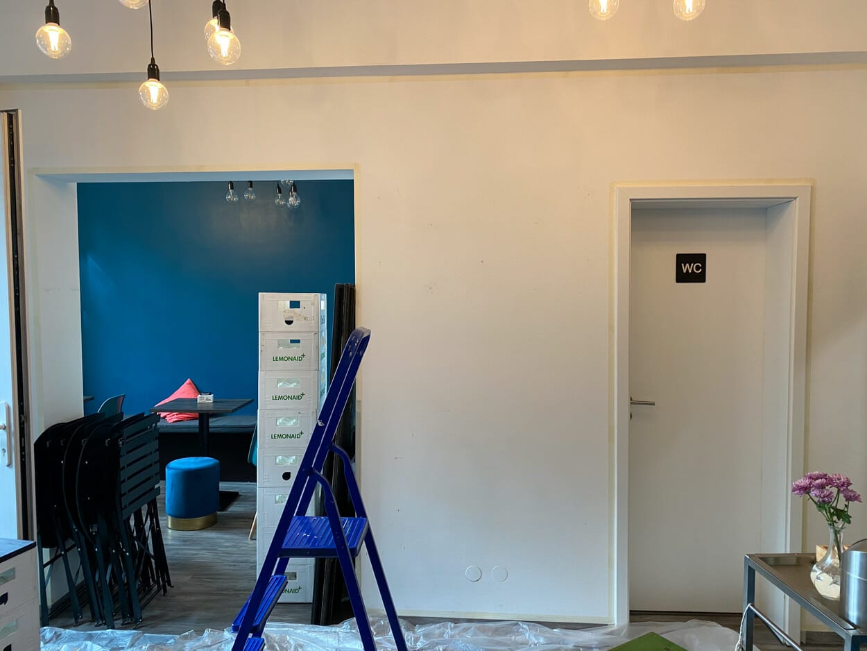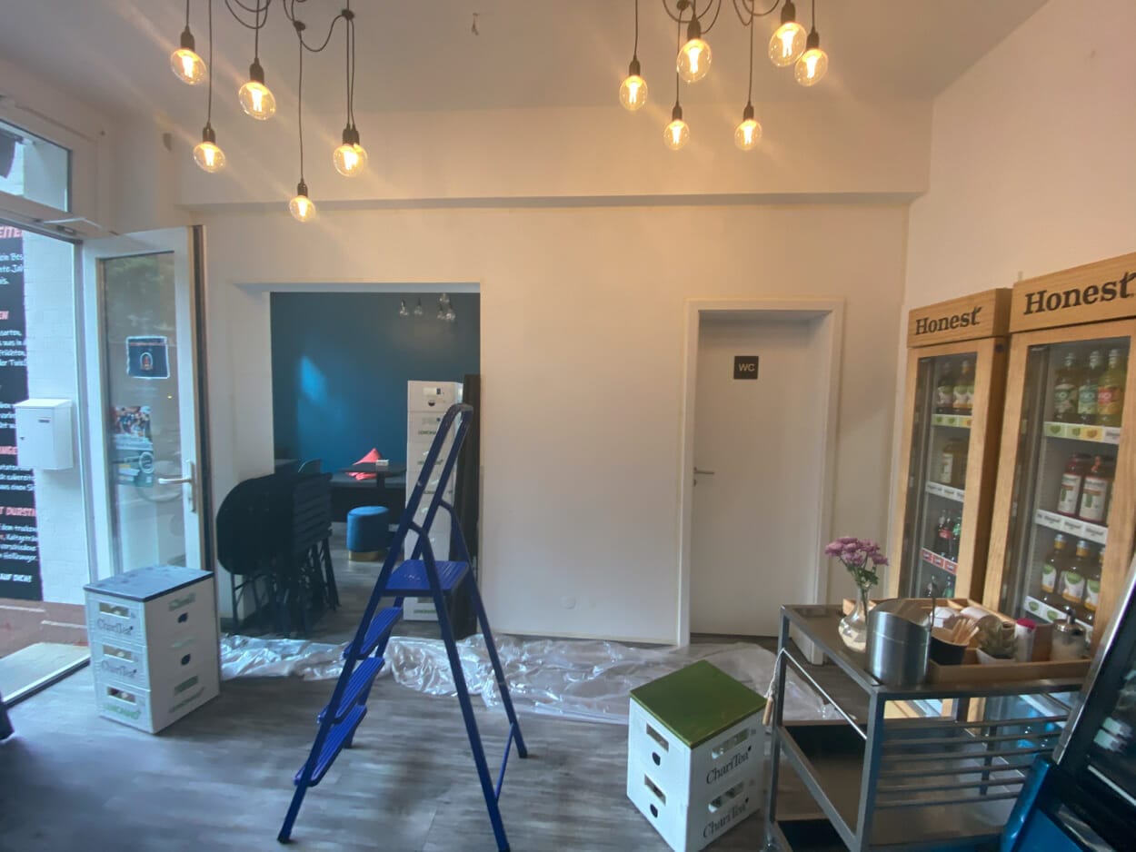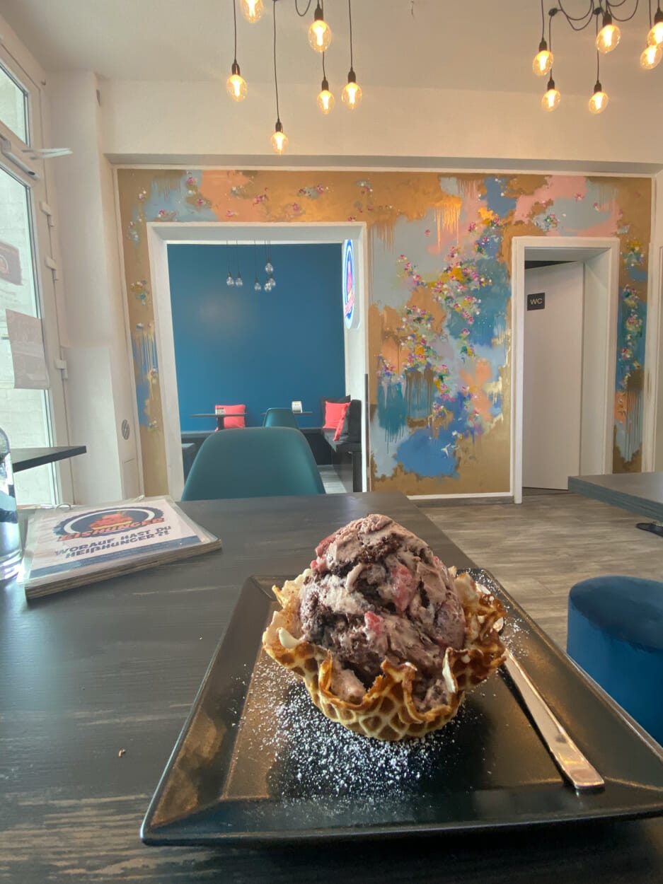 So tauschte ich für einen Tag meine Leinwand gegen eine feststehende Betonwand mitten in Winterhude. Eis (mit Geschmack) ist seit Jahrzehnten mein „täglich Brot“. Wenn man mich nach schönsten Erinnerungen fragen würde, würde definitiv immer ein Eis in den Geschichten auftauchen. Eis bei Opa im Garten, Eis am Eiffelturm, Eisbecher im Studium, ..usw. Nun kam Pari auf mich zu, Inhaberin von Eishunger und leidenschaftliche Eiskunstwerklerin. Wir sprachen über eine kleine Ausstellung, Motive, jedoch warfen wir alle Ideen um, nachdem wir 2-3 Waffeln voller gefrorenem Glück genascht hatten. Wir saßen vor dieser weißen Wand und zwei Wochen später war sie nicht mehr weiß, sondern Gold, Blau, Magenta und Grün. Mein Werk an der Wand von Eishunger ist einmalig, einladend, individuell und besonders, wie das Eis bei Eishunger.